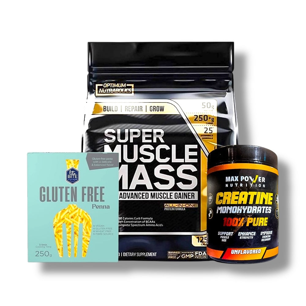 مكسب كتلة عضلية فائق + كرياتين فائق القوة + معكرونة خالية من الغلوتين - مجموعة تضخيم متقدمة