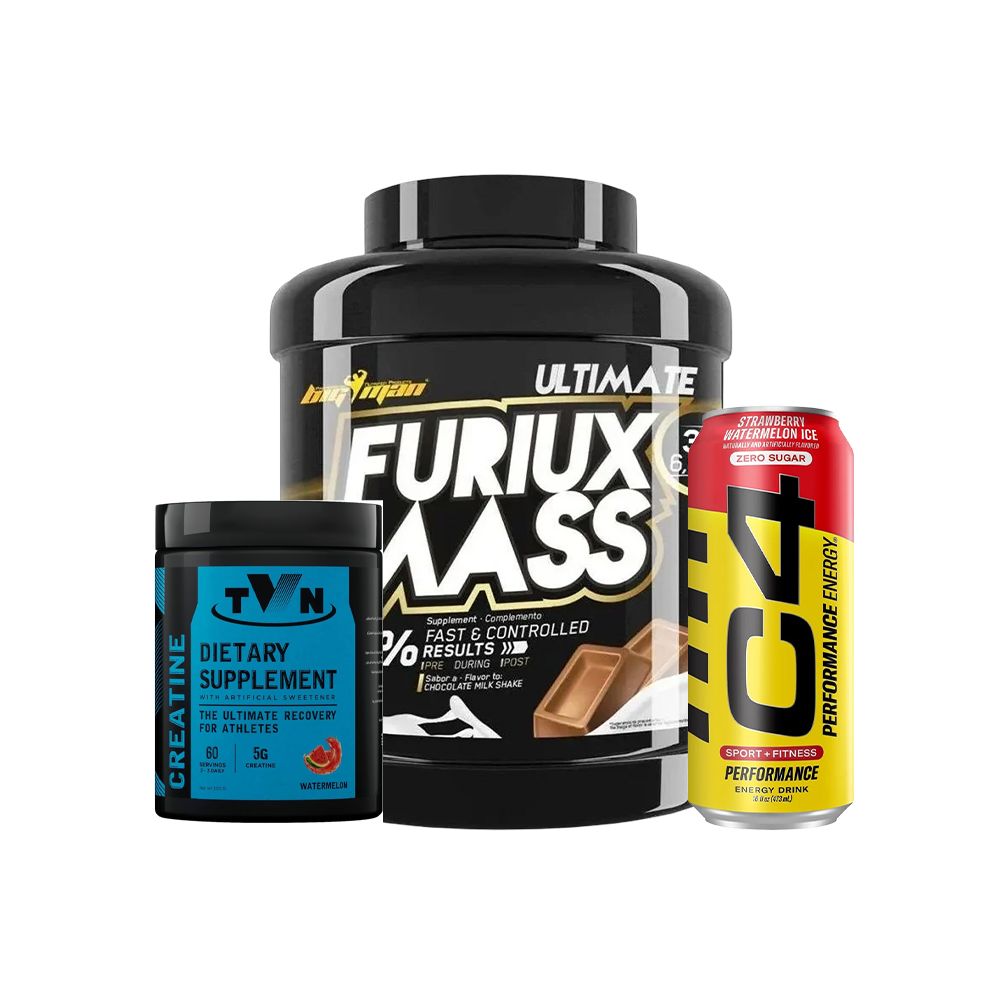 تركيبة بناء العضلات | فيوريوس ماس ٣ كجم + كرياتين TVN + مشروب الطاقة C4 | مجموعة الطاقة القصوى
