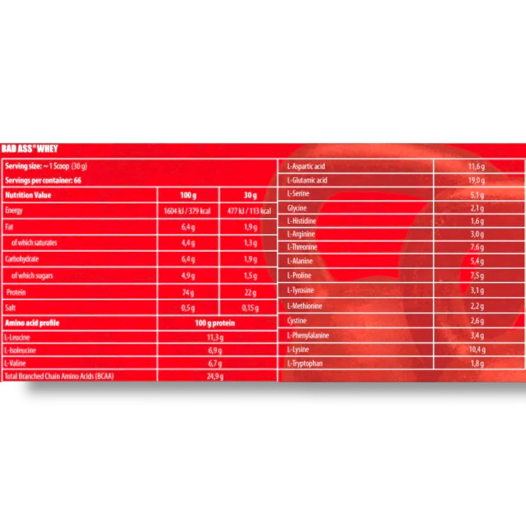 Bad Ass Whey Protein is a premium protein supplement designed to fuel muscle growth, enhance recovery, and support peak performance. Each serving delivers 22g of high-quality whey protein, along with 5.5g BCAAs and 2.5g L-Leucine, helping to maximize muscle repair and strength after intense workouts. With 66 servings per container, this formula is perfect for athletes and fitness enthusiasts who want great taste, fast absorption, and effective results. Available in delicious Chocolate Flavour, it’s your go-to protein for building lean muscle and powering through every training session.